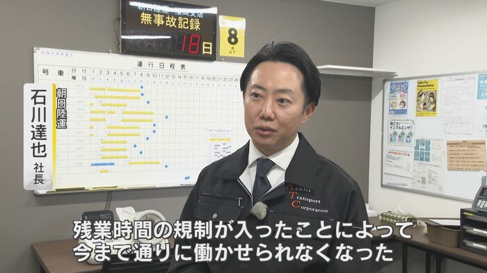 『朝日陸運』社長の石川達也さんは「今までは本当に運送業って稼げる業種ではあったんですけども、残業時間の規制が入ったことによって、やっぱ今まで通りに働かせられなくなったっていうところがあるんですよね」と規制によって業界を離れる人も増えていると話す。