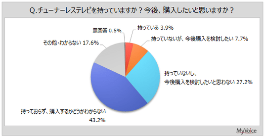 そのチューナーレステレビを持っている人は3.9%です。「持っていないが、今後購入を検討したい」が7.7%となっています。