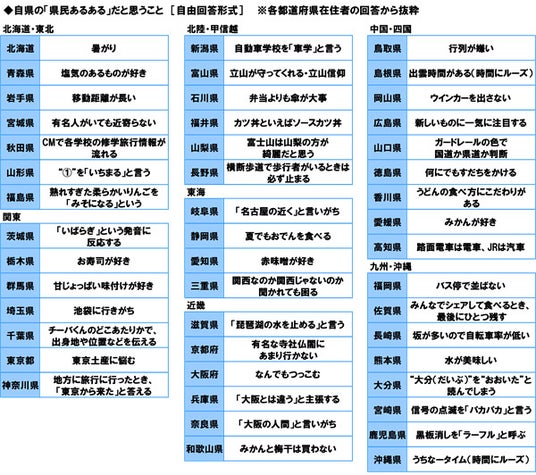 ◆自県の“県民の特徴”を表す一言 秋田県「ええふりこき」、群馬県「かかあ天下」、山梨県「地元愛」、愛知県「派手好き」、大阪府「いらち」、岡山県「我が道を行く」、広島県「熱しやすく冷めやすい」、香川県「へらこい」、高知県「酒飲み」、福岡県「熱い」、熊本県「わさもん」、沖縄県「よんなーよんなー」