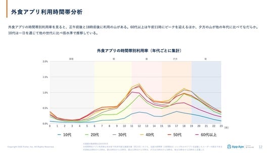 外食アプリの利用は正午前後と18時前後にピークがあり、昼食・夕食行動を反映した利用傾向が明確です。