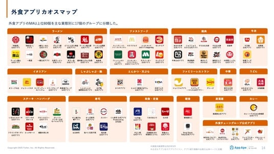MAU上位80のアプリを業態別に分類したカオスマップでは、ラーメン、ファストフード、焼肉、寿司など17の業態に分類。外食各社がアプリを通じた顧客接点を強化している様子がうかがえます。
