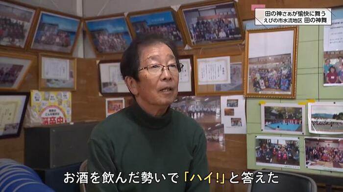 地区の飲み会のときに長老たちから取り囲まれて、「どしてんこしてん”田の神舞”の舞手を継いでくりゃい」と頼まれた。お酒を飲んだ勢いで「ハイ!」と答えた。