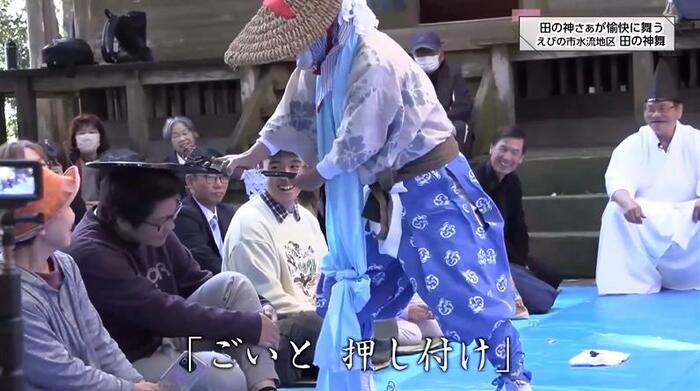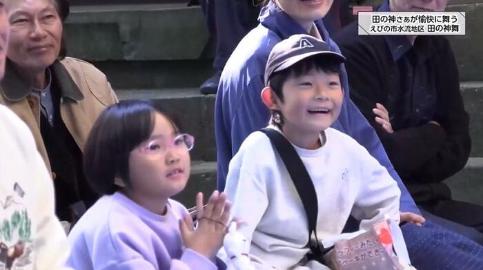 田の神の口上には周りから諸県弁でのツッコミも入り、観客を沸かせる。