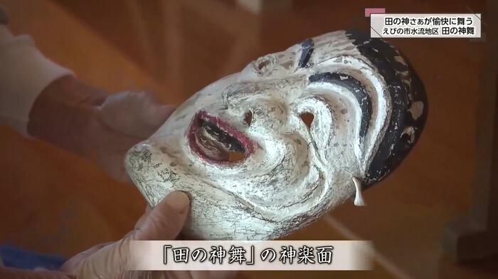 「田の神舞」の神楽面。面には「元文五年(1740年)三月」と刻まれている。約285年前に作られた面で、大切に受け継がれてきた。