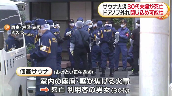 東京・赤坂の個室サウナで起きた火事で、死亡した2人が30代の夫婦であることが分かった。