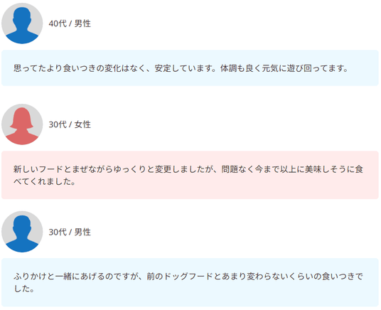 「食いつきが良くなった」という声からは、食事が待ち遠しい時間になった喜びが伝わってきます。
