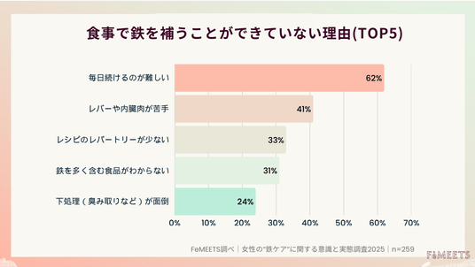 「食事で鉄を補いたい」と回答した女性は約90%に上り、食事での鉄補給へのニーズの高さが浮き彫りになりました。しかし実際には、以下のような課題が行動を妨げていることが判明。