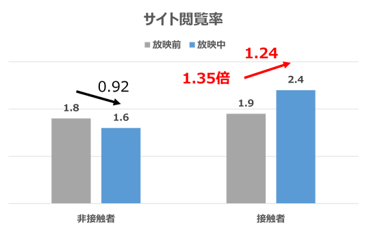 今回の調査結果からFamilyMartVisionの広告接触者/非接触者に関わらず、FamilyMartVision放映前から検索行動が生じていることから、一定程度の興味・関心はあったと推測します。その前提で、FamilyMartVision広告接触者は、放映前と比べて放映中の放映商材関連のワード検索率、サイト閲覧率ともに上昇しています。広告非接触は、放映前から中にかけてスコアが下がっており、接触者と非接触者のリフト差はワード検索率で2.05倍と高く、サイト閲覧率でも1.35倍になっており、検索行動への高い効果が確認できました。FamilyMartVisionの広告接触が商材の興味・関心を高め、放映前よりもさらなる検索行動に繋がったと考えられます。またワード検索/サイト閲覧も共にリフトしていることから、検索行動が単なるワード検索だけに留まらず、サイト閲覧までの一連のWeb上の行動を引き起こしたとも様子も窺えます。