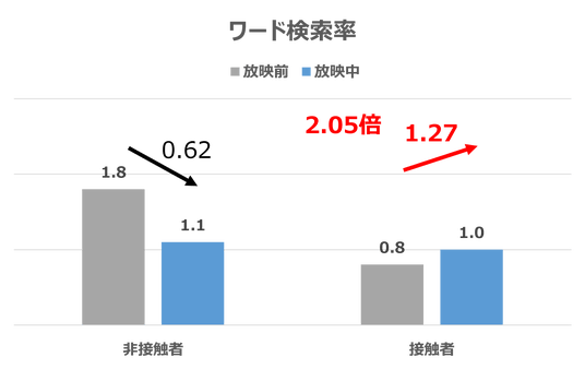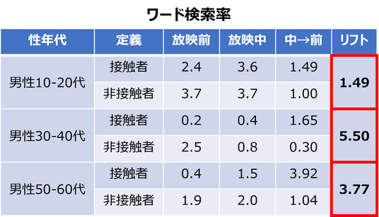 男性で検索行動が顕著だった点においては、放映商材の性質から興味・関心が比較的男性で高いと推測でき、広告接触によりさらに興味・関心を高めることに繋がったと考えられます。