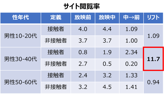 上記の分析を性別で分けると男性の検索行動が高く、特にワード検索率の年代別では、男性30-40代で5.50倍のリフト値、男性50-60代で3.77倍、男性10-20代で1.49倍と、全ての年代で顕著に効果が見られました。サイト閲覧率も同様に、男性30-40代で大幅なリフト値となり、検索行動の効果となりました。