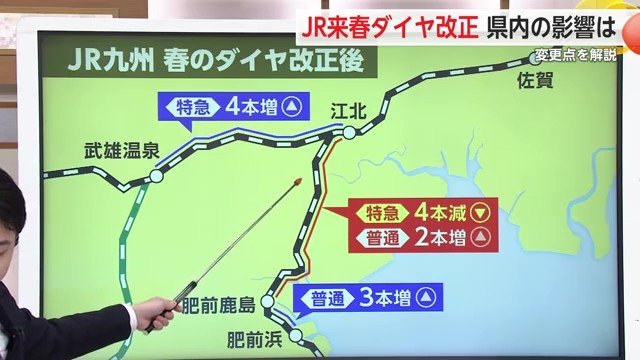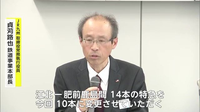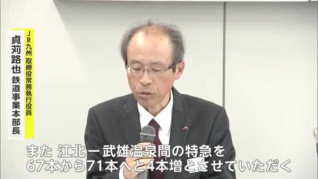 江北-鹿島間、14本の特急を今回10本に変更させていただきます。また、江北-武雄温泉間の特急を67本から71本へと、こちらにつきましては4本増とさせていただきます