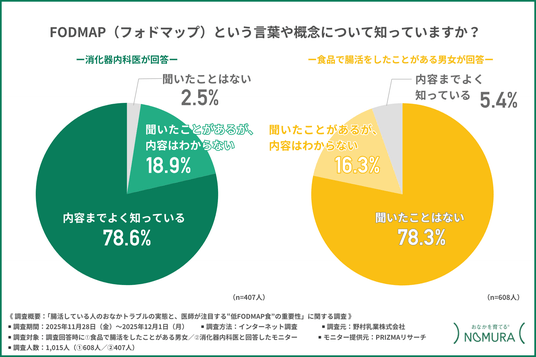 FODMAPについて、消化器内科医の約8割が内容をよく知っている一方、食品で腸活をしたことがある男女では約8割が『聞いたことがない』と回答しました。