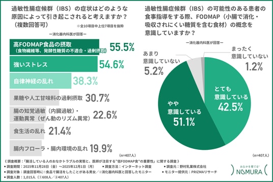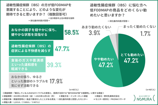 野村乳業株式会社(本社所在地:広島県安芸郡府中町、代表取締役:野村 和弘)は、1.食品で腸活をしたことがある男女/2.消化器内科医を対象に「腸活している人のおなかトラブルの実態と医師が注目する“低FODMAP食”の重要性」に関する調査を行いました。
