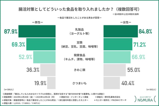そこで今回、野村乳業株式会社(https://www.nomura-milk.co.jp/)は、1.食品で腸活をしたことがある男女/2.消化器内科医を対象に「腸活している人のおなかトラブルの実態と医師が注目する“低FODMAP食”の重要性」に関する調査を行いました。