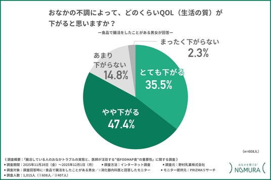 「おなかの不調によって、どのくらいQOL(生活の質)が下がると思うか」について尋ねたところ、『とても下がる(35.5%)』『やや下がる(47.4%)』『あまり下がらない(14.8%)』『まったく下がらない(2.3%)』と続きました。