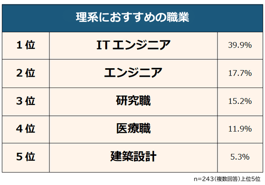アンケートの結果、理系出身者におすすめの職業としてトップに挙がったのは「ITエンジニア」でした。他にも「エンジニア」「研究職」「医療職」「建築設計」と、専門性や論理的思考力を活かせる職種が多くなっています。