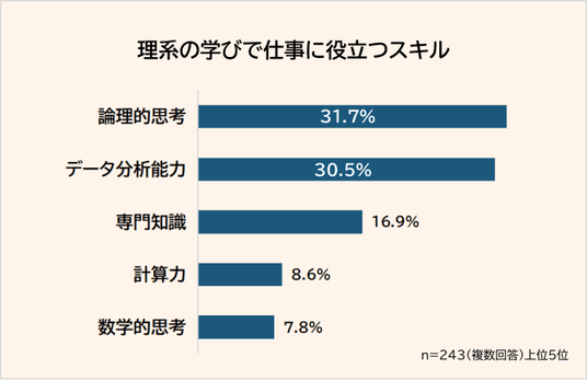 「理系の学びで仕事に役立つスキルは何か?」という問いに対して最も多かった回答は、「論理的思考(31.7%)」、僅差の2位は「データ分析能力(30.5%)」でした。以下、3位「専門知識(16.9%)」、4位「計算力(8.6%)」、5位「数学的思考(7.8%)」の結果です。