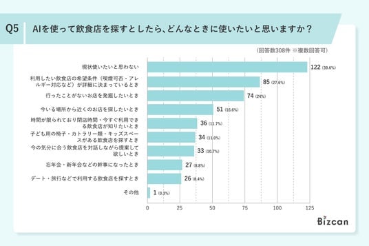 AIを使って飲食店を探すとしたら、どんな時に使いたいと思いますか?という質問に対して、39.6%が「現状使いたいと思わない」と回答しました。※複数回答可