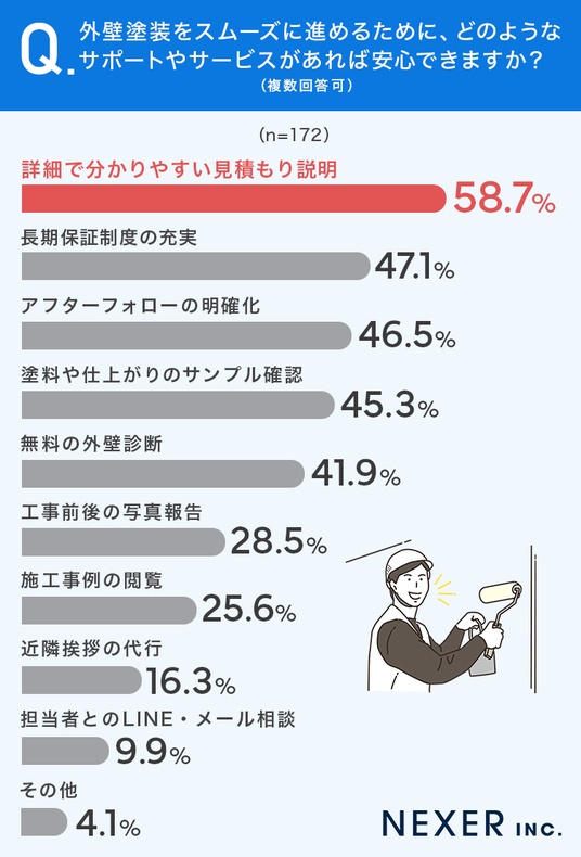 ■58.7%が、外壁塗装をスムーズに進めるために「分かりやすい見積もり説明」に関するサポートを求めている
