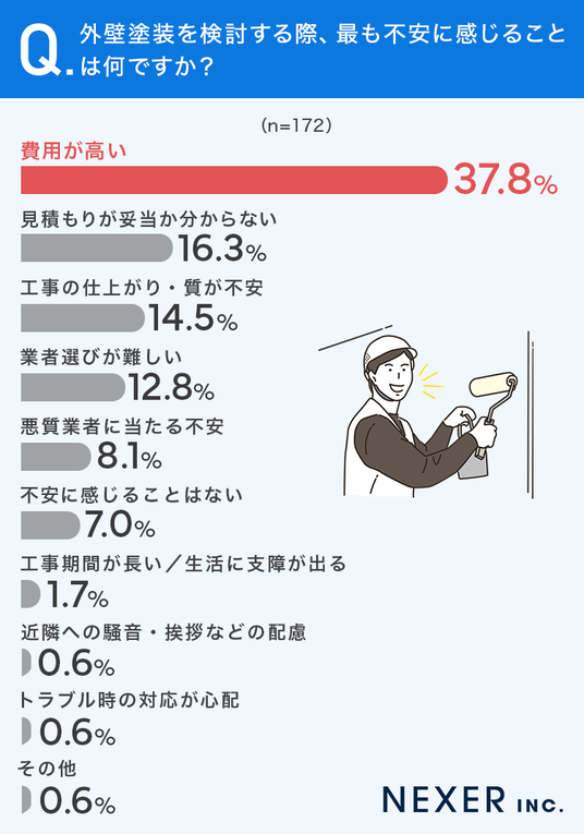 まずは、外壁塗装を検討する際に不安に感じる点を聞いてみました。