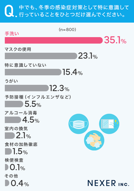 中でも、冬季の感染症対策としてとくに意識して行っていることをひとつだけ選んでもらいました。
