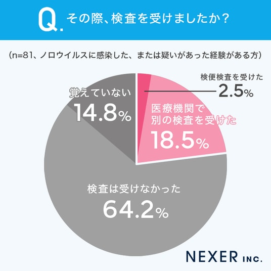 次に、ノロウイルスに感染した、または疑いがあった際、検査を受けたかを聞いてみました。