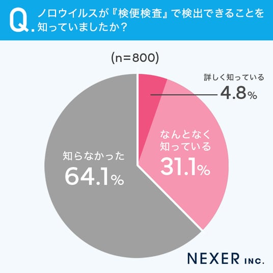 ノロウイルスが検便で検出できることを「知らなかった」と回答した方が64.1%に上り、「詳しく知っている」はわずか4.8%でした。