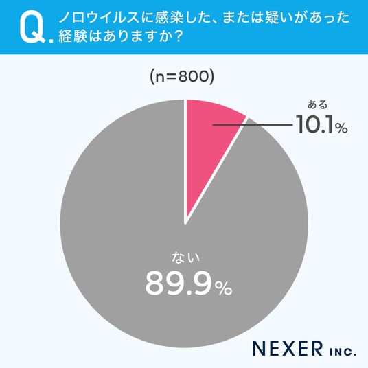 ノロウイルスに感染した、または疑いがあった経験が「ある」と回答したのはわずか10.1%でした。
