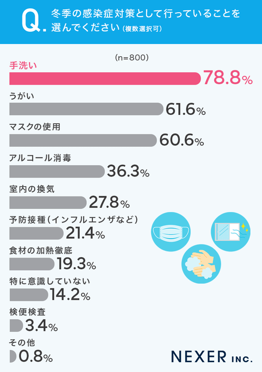 ■78.8%が、冬季の感染症対策として行っていることは「手洗い」