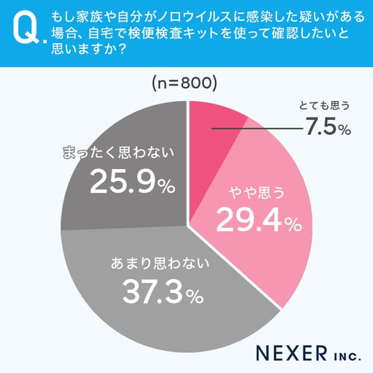続いて、もし家族や自分がノロウイルスに感染した疑いがある場合、自宅で検便検査キットを使って確認したいと思うかを聞いてみました。