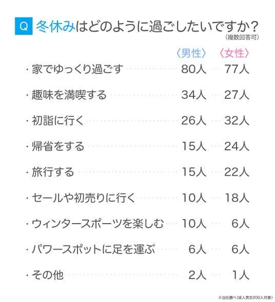 成人男女200人に、冬休みはどのように過ごしたいか尋ねたところ、「家でゆっくり過ごす」が最も多い結果となりました。
