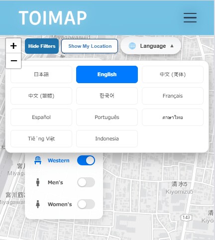 TOIMAPでは2025年11月より、従来の日本語・英語に加え、中国語(簡体・繁体)、韓国語、フランス語、スペイン語、ベトナム語など計11言語への対応を開始しました。 そして、機能リリース直後から、英語以外の言語設定によるアクセスが観測され始めました。 単なるマップ利用だけでなく、各言語での「日本のトイレの使い方(マナー啓発)」ページの閲覧も確認されています 。