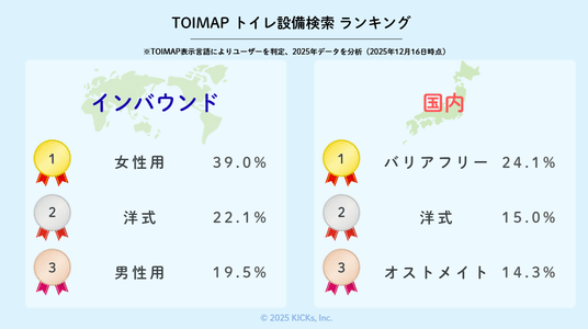 社会課題解決型トイレマップ「TOIMAP(トイマップ)」を運営する株式会社KICKs(本社:京都府京都市、代表取締役:山本健人)は、アプリ内の検索データ(2025年8月~12月)の利用状況を分析しました。