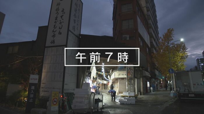 “博多の台所”ともいわれる福岡市中央区の柳橋連合市場の午前7時。まだ空は、明け切れていない。