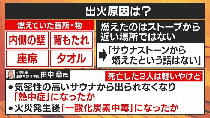 死亡した2人は軽いやけどを負っていたといいますが、元深谷市消防本部消防長の田中章氏によると、気密性の高いサウナから出られなくなり熱中症になったか、火災発生後に一酸化炭素中毒になり死亡した可能性があるといいます。