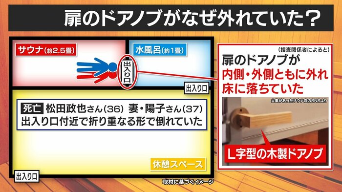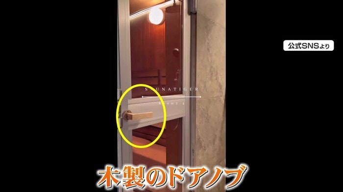 現場となった個室サウナの映像を見てみると、入口は透明なガラス戸で、L字型の木製のドアノブがついているのがわかります。