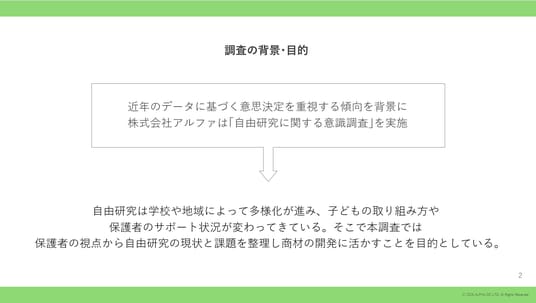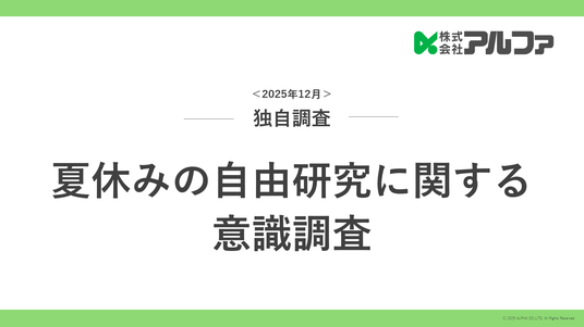 近年のデータに基づく意思決定を重視する傾向を背景に、株式会社アルファは、多様化が進む「夏休みの自由研究」に関する意識調査を実施した。現状と課題を整理し、その結果を販促施策の開発に活かすことを目的としている。