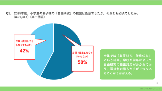 全体では「必須58%、任意42%」という結果。学校や学年によって自由研究の提出対応が分かれており、選択制の導入が広がりつつあることがうかがえる。
