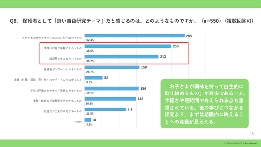 「お子さまが興味を持って自主的に取り組めるもの」が最多である一方、手軽さや短時間で終えられる点も重視されている。後の学びにつながる探究より、まずは期限内に終えることへの意識が見られる。
