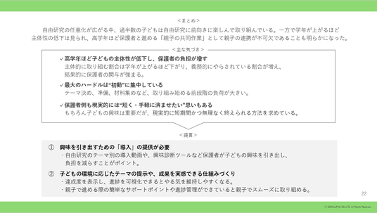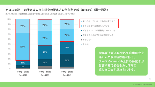 自由研究の任意化が広がる中、過半数の子どもは自由研究に前向きに楽しんで取り組んでいる。一方で学年が上がるほど主体性の低下は見られ、高学年ほど保護者と進める「親子の共同作業」として親子の連携が不可欠であることも明らかになった。