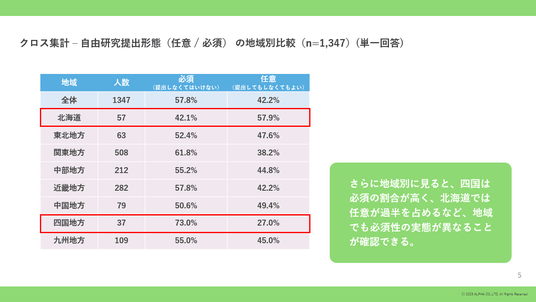 さらに地域別に見ると、四国は必須の割合が高く、北海道では任意が過半を占めるなど、地域でも提出区分の実態が異なることが確認できる。