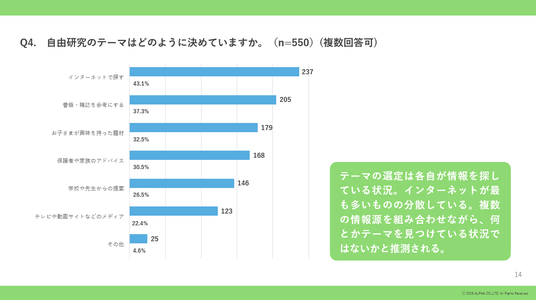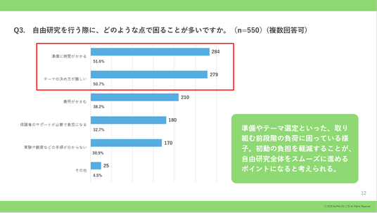 準備やテーマ選定といった、取り組む前段階の負荷に困っている様子。初動の負担を軽減することが、自由研究全体をスムーズに進めるポイントになると考えられる。