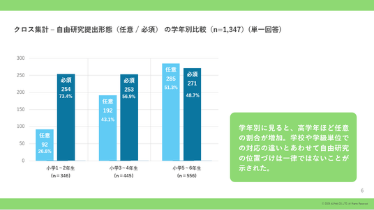 学年別に見ると、高学年ほど任意の割合が増加。学校や学級単位での対応の違いとあわせて自由研究の位置づけは一律ではないことが示された。