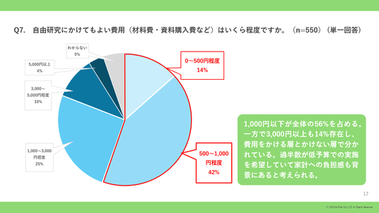 1,000円以下が全体の56%を占める。一方で3,000円以上も14%存在し、費用をかける層とかけない層で分かれている。過半数が低予算での実施を希望していて家計への負担感も背景にあると考えられる。