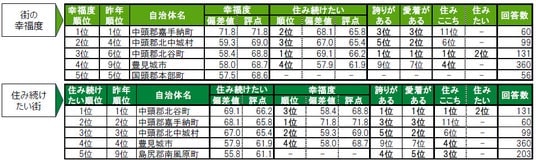 ※街の幸福度・住み続けたい・街に誇りがある・街に愛着があるの項目で順位が「-」と表示されている場合は、偏差値50未満を意味します。