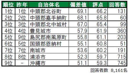 1位は2年連続で中頭郡北谷町で、「住みここち」でもトップとなっている自治体です。2位も2年連続で中頭郡嘉手納町、3位は3年連続で中頭郡北中城村で、トップ3は全て中頭郡に属する「町」や「村」という結果になっています。トップ9内では、昨年は偏差値50未満で順位非公開だった沖縄市が、今年は9位となっています。