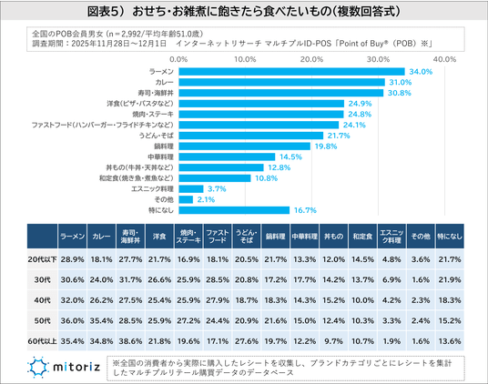 ・正月料理に飽きたら食べたいものはラーメンが34.0%で最多、カレーが31.0%で続く