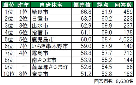 姶良市が、3年連続で1位に輝きました。2位も、3年連続で日置市です。3位は出水市で、2年連続でのランクインです。トップ10内では、昨年は偏差値50未満で順位非公開だった、8位南さつま市、9位薩摩郡さつま町(さつまちょう)が、今年はトップ10入りしています。