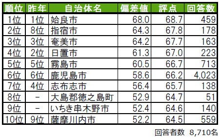 1位は3年連続で姶良市で、「住みここち」や「住み続けたい街」など複数のランキングでトップに輝いている自治体です。2位は、昨年8位から順位を上げた指宿市です。3位は、2年連続で奄美市です。トップ10内で今回初登場の自治体は8位の大島郡徳之島町(とくのしまちょう)で、昨年は累計回答者数が50名未満でランキングの集計対象外でした。その他、昨年は偏差値50未満で順位非公開だったいちき串木野市が、今年は9位となっています。