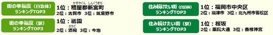 街の幸福度ランキングは、 「全体としてみて、あなたは現在、幸せですか、あるいは不幸せですか」に対して、 1点(非常に不幸)から10点(非常に幸福)までの10段階で評価してもらい、その回答の平均値を10倍して、100点満点に換算。住み続けたい街ランキングは、「今住んでいる街に、ずっと住んでいたいと思う」に対して、 「そう思う」:100点から「そう思わない」:0点までの5段階評価をしてもらい、その回答の平均値で作成。「誇りがある」「愛着がある」も「住み続けたい街ランキング」と同様の方法で作成。